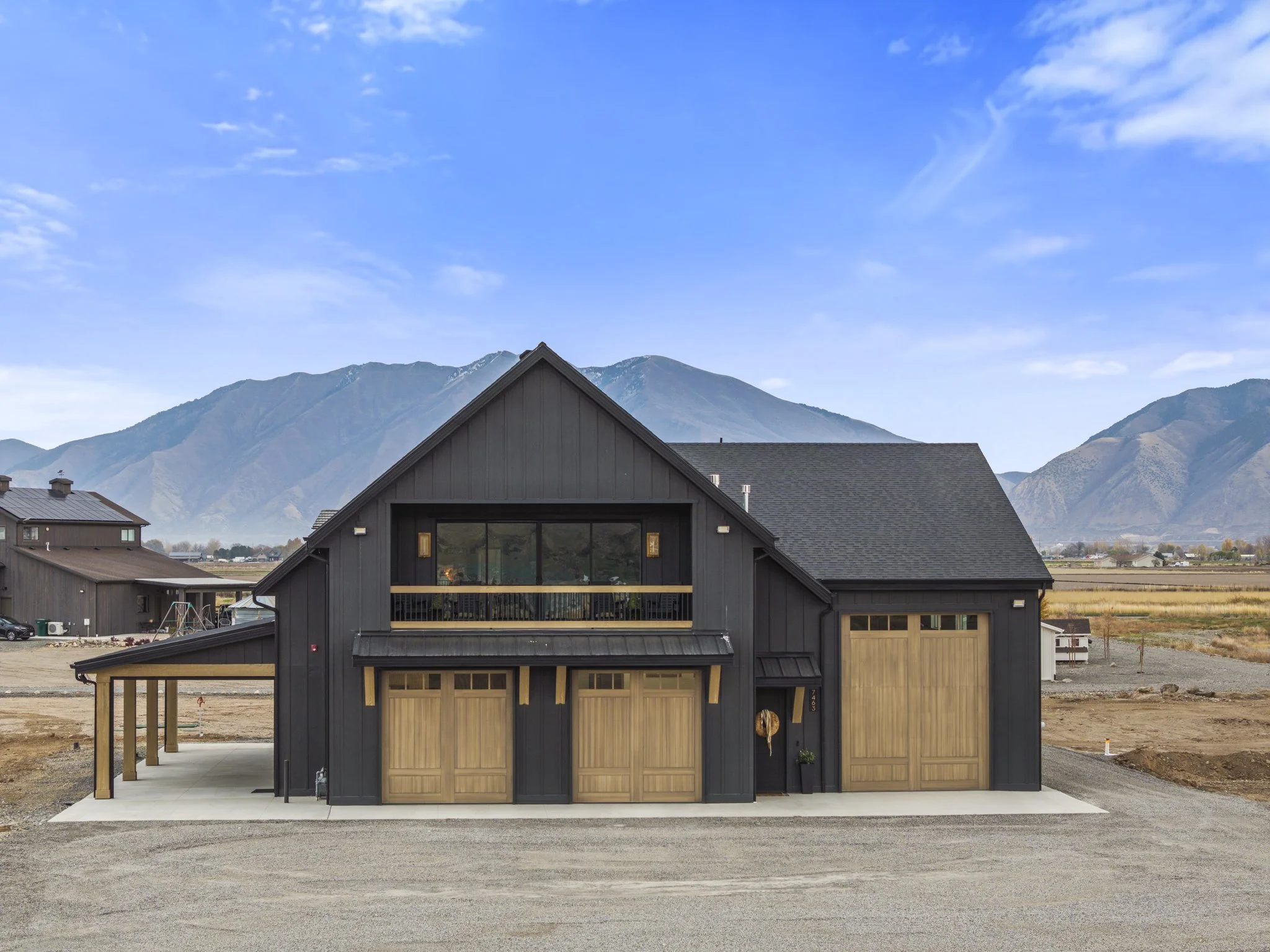 This custom Barndominium stands out in the farmlands of Benjamin, Utah, with its striking dark-and-light exterior contrast and refined craftsmanship. Its multiple garage bays offer ample space for all your toys, complete with a custom workbench, wash bay, and even a full golf simulator. Upstairs, the 2-bedroom, 1-bath layout features an open-concept design that creates a bright, comfortable, and welcoming living space. You truly get the best of both worlds—comfortable living above and exceptional recreation and workspace below. And with an unobstructed, unforgettable view of West Mountain, this Barndominium offers a backdrop that’s as impressive as the home itself.